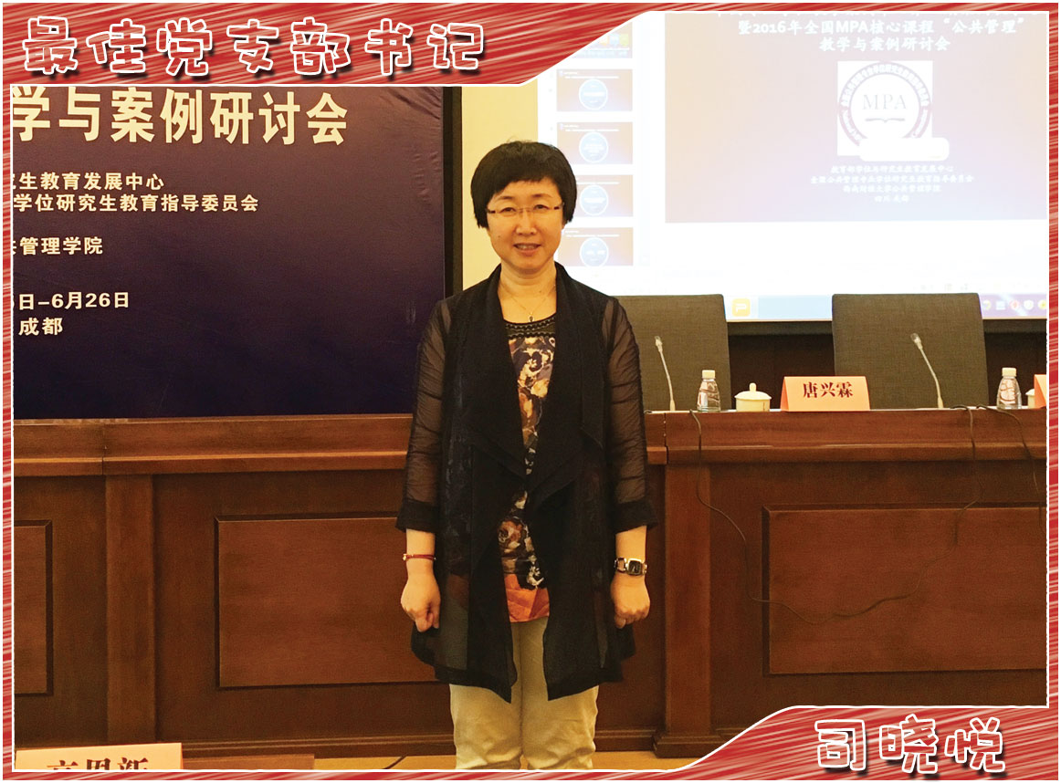 2016年,作为全院最大系所的支部书记,她虚心学习、刻苦专研、认真负责,在支部内认真开展“两学一做”学习教育,超额完成上级党组织的各项工作任务,在系内做了党课教育,并组织系内教师前往大庆,学习大庆精神。她讲求方法,团结非党教师,带领全系老师在教学、学生培养、科研以及社会服务等方面取得了丰硕成果,受到全院师生的好评。作为支部书记,她率先垂范,成绩突出:2016年承担国家社科基金一般项目、沈阳市统计局项目各1项,年度科研进款23.5万元,在科研丰收的同时,她还承担了本科生、研究生共计6门课程,指导硕士研究生31人。