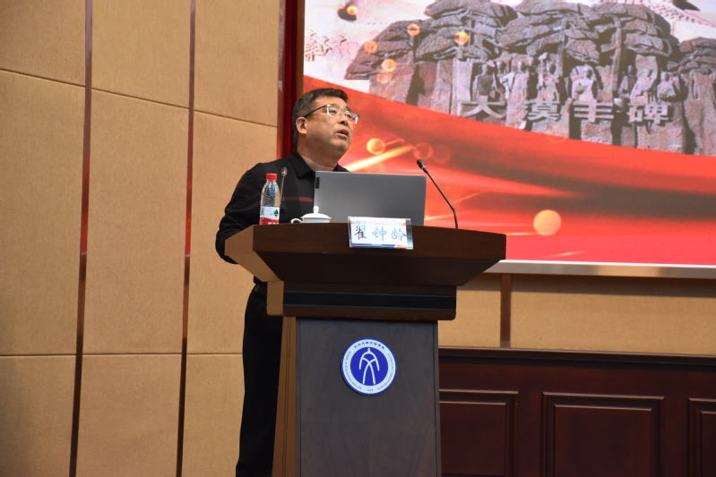 翟钟龄向师生介绍了彰武治沙的历史经历与相关成果,并详细阐述了70年来42万彰武人寸步不退,坚守奉献形成的彰武治沙精神。他以浓缩彰武七十年治沙历程的纪录片《彰武治沙》为引入,全方位展现了彰武地区多年来在治理沙化土地方面获得的显著成效,并从刘斌、董福财等为代表的彰武治沙人的光辉事迹入手,向全体师生系统阐述了以“矢志不移、永不退缩、默默无闻、甘于奉献”为核心的彰武治沙精神,彰显一代代治沙人敢为人先、百折不挠,为保卫国家生态安全和改善人民生活环境做出的巨大贡献,并号召参会师生积极参与生态文明建设,发挥自身优势,为构筑生态安全屏障贡献自己的力量。