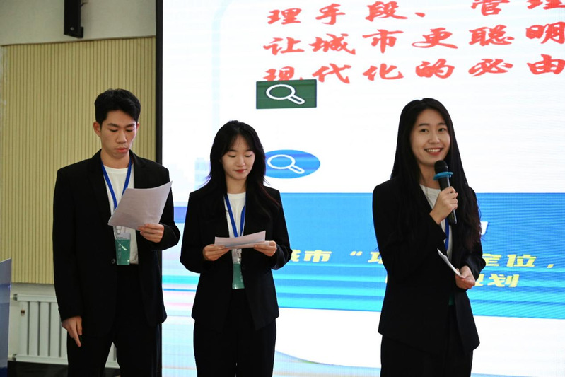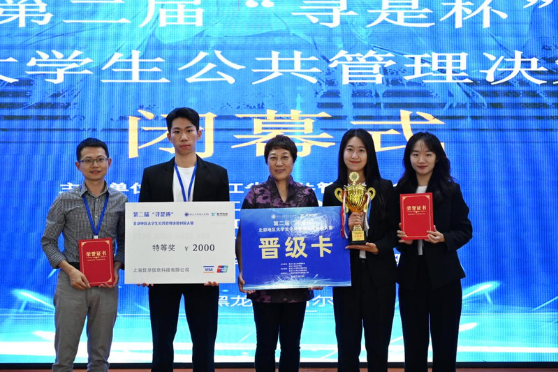 大赛由公共管理方案设计、决策沙盘对抗和现场团队答辩三部分构成。在比赛过程中,三位同学逻辑清晰、沉着作答、团结协作,运用专业知识剖析问题,对数字时代下智慧城市的政府责任进行思考,为城市现代化治理体系的完善与创新提供了借鉴,充分展现了参赛选手良好的理论知识和综合素养。