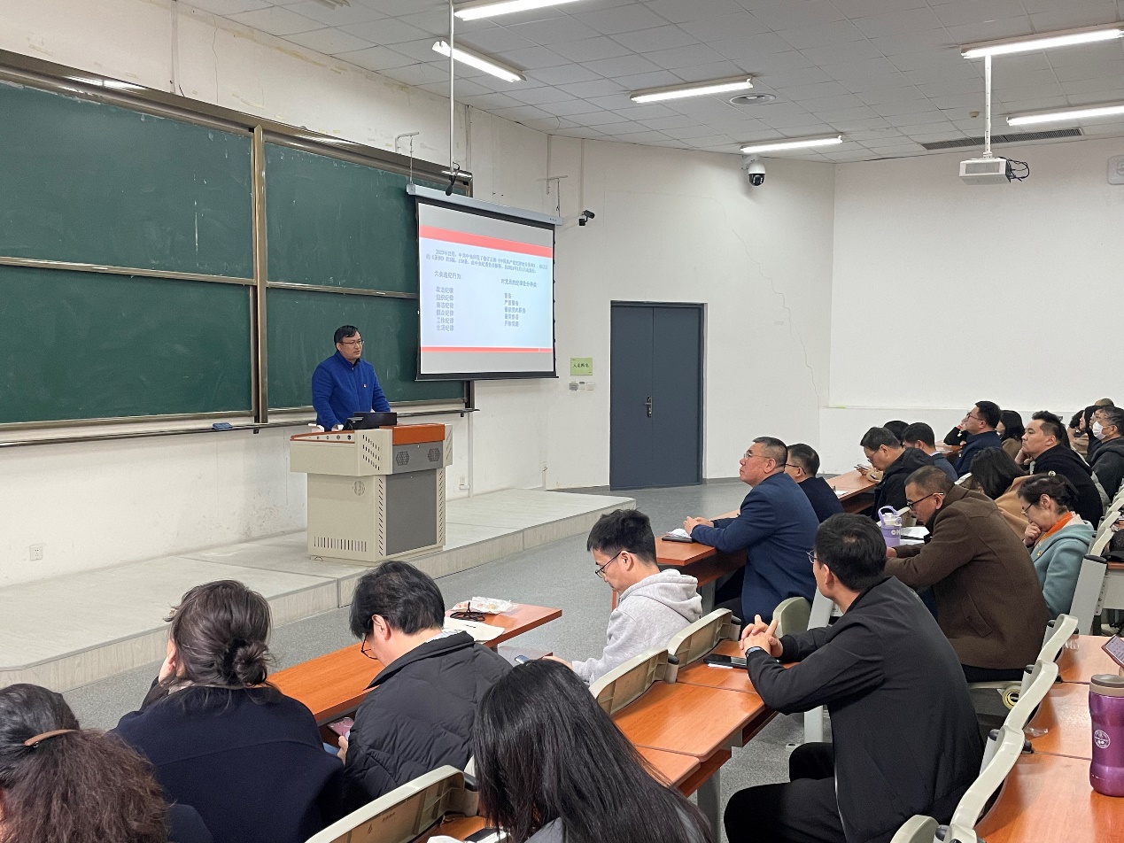 党委副书记、纪委书记孙宏伟讲述了高校违法违纪典型案例,结合相关案例就教职工行为规范进行了师德师风教育。